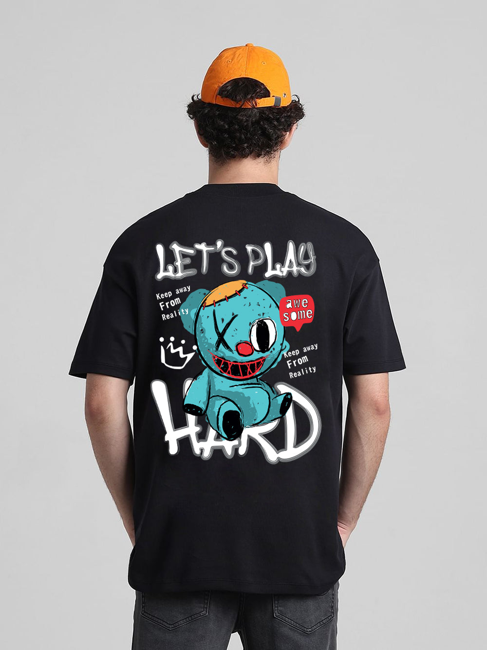 T-Hustler Let’s Play Hard Back Printed Oversized Cotton Terry T-Shirt – Half Sleeve Round Neck